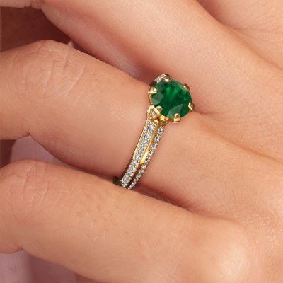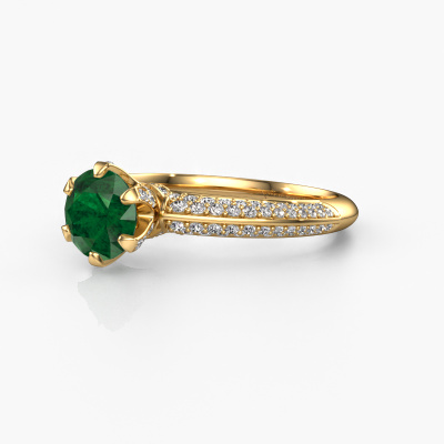 The ring shown above is called the Abby. We call this type of ring a pavé solitaire ring because it has one centre gemstone and a band that is also pave set with gemstones. The 14 Carat gold engagement ring is set with a round 6.5 mm emerald centre stone and the band is pave set with diamond gemstones. Each jewel is made just for you by our master goldsmiths in our own studio.This exclusive gold pavé solitaire engagement ring has an exquisite round emerald centre stone. To further accentuate the centre stone, the band is fully set with more diamonds. Its open prong setting allows light to strike the emerald from various angles and this adds sparkle to your emerald ring. The photo shown above depicts the goldsmith's carefully handcrafted details of the ring. The high positioning of the centre stone is truly eye-catching. The perfect engagement ring for the crown jewel of your life! Are you on a budget? Please feel free to contact us, so we can go discuss your options. We offer our engagement rings at guaranteed best price, because we make them to order. You won't find such a price anywhere else!Our team adds new designs to our online collection daily. Our designers and goldsmiths work together in creating the best design. We strive to offer a diverse collection of jewels. Perhaps you have a specific jewel design in mind. One you came across somewhere. Please contact us for a free consultation. We will make you an offer, based on a fair price/ quality ratio, that will baffle you.To make it easier for you, we offer a 30 day return policy. Check our terms and conditions.