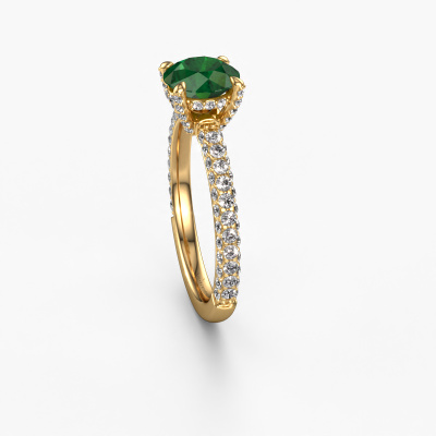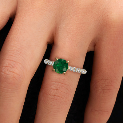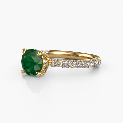 The ring shown above is called the Saskia rnd 2. We call this type of ring a pavé solitaire ring because it has one centre gemstone and a band that is also pave set with gemstones. The 14 Carat gold engagement ring is set with a round 7 mm emerald centre stone and the band is pave set with lab grown diamond gemstones. Each jewel is made by a team of passionate goldsmiths and jewel designers. This will make your crown jewel truly eye-catching.This exclusive gold pavé solitaire engagement ring has an exquisite round emerald centre stone. To further accentuate the centre stone, the band is fully set with more lab-grown diamonds. Its open prong setting allows light to strike the emerald from various angles and this adds sparkle to your emerald ring. The photo shown above depicts the goldsmith's carefully handcrafted details of the ring. The high positioning of the centre stone is truly eye-catching. The perfect engagement ring for the crown jewel of your life! After receiving your order, our goldsmiths will passionately start the creative process of making your engagement ring in our own studio. Because we don't have a big stockpile, these costs will not be passed on to you. Our pricing is proof of that! We offer top quality jewels at lowest price, guaranteed.Our team adds new designs to our online collection daily. Our designers and goldsmiths work together in creating the best design. We strive to offer a diverse collection of jewels. Perhaps you have a specific jewel design in mind. One you came across somewhere. Please contact us for a free consultation. We will make you an offer, based on a fair price/ quality ratio, that will baffle you.To make it easier for you, we offer a 30 day return policy. Check our terms and conditions.