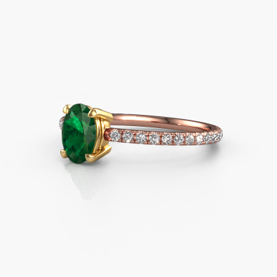 The ring shown above is called the Lynelle 2. We call this type of ring a pavé solitaire ring because it has one centre gemstone and a band that is also pave set with gemstones. This engagement ring is made in 14 Carat rose gold set with a 7x5 mm oval emerald, and pave set diamonds at the sides. Each piece of jewellery is created to add sparkle to your finger, each jewel is lovingly made by hand by our goldsmiths.This classic rose gold pavé solitaire engagement ring has an exquisite oval emerald centre stone. To further accentuate the centre stone, the band is set full with more diamonds. Its open prong setting allows light to strike the emerald from various angles and this adds sparkle to your emerald ring. The photo shown above depicts the goldsmith's carefully handcrafted details of the ring. The high positioning of the centre stone is truly eye-catching. The perfect engagement ring for the crown jewel of your life!After receiving your order, our goldsmiths will start the creative process of making your Lynelle 2 engagement ring. We don't keep stock. This is advantageous because these costs will not be passed on to you. Therefore, we can offer jewellery at exceptionally low prices.Do you have a specific ring in mind? One you came across somewhere. Please feel free to tell us your wishes and we will turn your design into a unique engagement ring. You can follow the development of your ring design because we use 3D drawings. This gives you a realistic preview of your design. We will gladly send you a non-binding offer, based on a fair price/ quality ratio. It will amaze you.To make it easier for you, we offer a 30 day return policy. Check our terms and conditions.