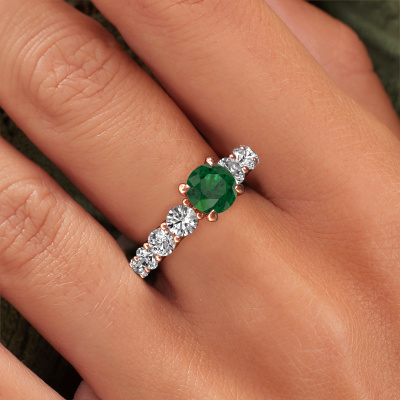 The ring shown above is called the Deja. We call this type of ring a pavé solitaire ring because it has one centre gemstone and a band that is also pave set with gemstones. This engagement ring is made in 14 Carat rose gold set with a 6.5 mm round emerald, and pave set lab-grown diamonds at the sides. Each piece of jewellery is made just for you by our master goldsmiths in our own studio.This exclusive rose gold pavé solitaire engagement ring has an exquisite round emerald centre stone. To further accentuate the centre stone, the band is set full with more lab-grown diamonds. Its open prong setting allows light to strike the emerald from various angles and this adds sparkle to your emerald ring. The photo shown above depicts the goldsmith's carefully handcrafted details of the ring. The high positioning of the centre stone is truly eye-catching. The perfect engagement ring for the crown jewel of your life!By using a combination of the latest modern techniques, combined with ancient crafting, we can make all our engagement rings in our own studio. Each jewel is made to order. This is advantageous because we can offer you a price you won't find anywhere else.Our team adds new designs to our online collection daily. Our designers and goldsmiths work together in creating the best design. We strive to offer a diverse collection of jewels. Perhaps you have a specific jewel design in mind. One you came across somewhere. Please contact us for a free consultation. We will make you an offer, based on a fair price/ quality ratio, that will baffle you.To make it easier for you, we offer a 30 day return policy. Check our terms and conditions.