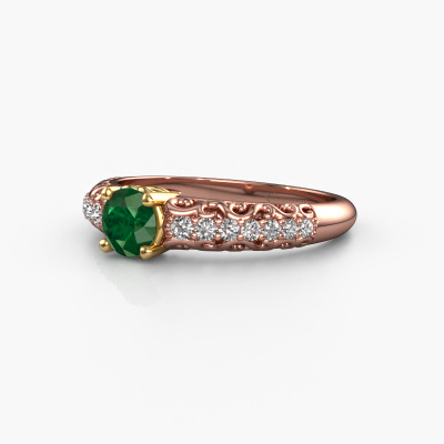 This 14 Carat rose gold ring is called Mellie and is set with 5 mm emerald. What is it that makes your relationship unique? What is it about her that makes you want to bend down on one knee? The unique bond between the two of you is emphasized by an equally unique ring. A one of a kind filigree pavé solitaire engagement ring made especially for her. That is why this vintage ring fits her like a glove. Each specific detail of this filigree rose gold emerald set engagement ring is hand-picked, crafted and polished by our expert goldsmith. The result is an exquisite ring, unique and perfectly crafted to perfection. That is what our expert Goldsmiths strive for. This jewel is made by a team of passionate goldsmiths and jewel designers. This will make your crown jewel truly eye-catching.Are you on a budget? Please feel free to contact us, so we can go discuss your options. We offer our engagement rings at guaranteed best price, because we make them to order. You won't find such a price anywhere else!Have you found a specific engagement ring somewhere which you would like to give to your loved one? Please feel free to express your wishes to our jewel designers because we would be honoured to turn your design into a vintage engagement ring. You can follow the development of your ring design because we use 3D drawings. This gives you a realistic preview of how your design will look. You can also preorder a dummy. A dummy is a plastic ring, which can be shaped according your ring design. You can try it on and check if its width and size are suitable for you. We will gladly send you a non-binding offer, based on a fair price/ quality ratio. It will amaze you, considering the quality of the ring and gemstones.To make it easier for you, we offer a 30 day return policy. Check our terms and conditions.