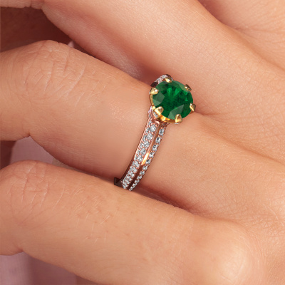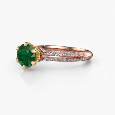 The ring shown above is called the Abby. We call this type of ring a pavé solitaire ring because it has one centre gemstone and a band that is also pave set with gemstones. The 14 Carat rose gold engagement ring is set with a round 6.5 mm emerald centre stone and the band is pave set with diamond gemstones. Each jewel is made just for you by our master goldsmiths in our own studio.This exclusive rose gold pavé solitaire engagement ring has an exquisite round emerald centre stone. To further accentuate the centre stone, the band is fully set with more diamonds. Its open prong setting allows light to strike the emerald from various angles and this adds sparkle to your emerald ring. The photo shown above depicts the goldsmith's carefully handcrafted details of the ring. The high positioning of the centre stone is truly eye-catching. The perfect engagement ring for the crown jewel of your life! Are you on a budget? Please feel free to contact us, so we can go discuss your options. We offer our engagement rings at guaranteed best price, because we make them to order. You won't find such a price anywhere else!Our team adds new designs to our online collection daily. Our designers and goldsmiths work together in creating the best design. We strive to offer a diverse collection of jewels. Perhaps you have a specific jewel design in mind. One you came across somewhere. Please contact us for a free consultation. We will make you an offer, based on a fair price/ quality ratio, that will baffle you.To make it easier for you, we offer a 30 day return policy. Check our terms and conditions.