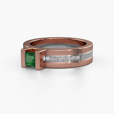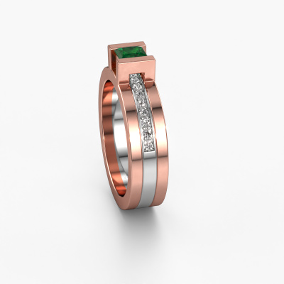 The ring shown above is called the Desire. We call this type of ring a pavé solitaire ring because it has one centre gemstone and a band that is also pave set with gemstones. The 14 Carat rose gold engagement ring is set with a princess 4 mm emerald centre stone and the band is pave set with diamond gemstones. Each jewel is made just for you by our master goldsmiths in our own studio.This modern rose gold pavé solitaire engagement ring has an exquisite princess emerald centre stone. To further accentuate the centre stone, the band is fully set with more diamonds. Its open prong setting allows light to strike the emerald from various angles and this adds sparkle to your emerald ring. The photo shown above depicts the goldsmith's carefully handcrafted details of the ring. The high positioning of the centre stone is truly eye-catching. The perfect engagement ring for the crown jewel of your life! By using a combination of the latest modern techniques, combined with ancient crafting, we can make all our engagement rings in our own studio. Each jewel is made to order. This is advantageous because we can offer you a price you won't find anywhere else.Have you found a specific engagement ring somewhere which you would like to give to your loved one? Please feel free to express your wishes to our jewel designers because we would be honoured to turn your design into a modern engagement ring. You can follow the development of your ring design because we use 3D drawings. This gives you a realistic preview of how your design will look. You can also preorder a dummy. A dummy is a plastic ring, which can be shaped according your ring design. You can try it on and check if its width and size are suitable for you. We will gladly send you a non-binding offer, based on a fair price/ quality ratio. It will amaze you, considering the quality of the ring and gemstones.To make it easier for you, we offer a 30 day return policy. Check our terms and conditions.