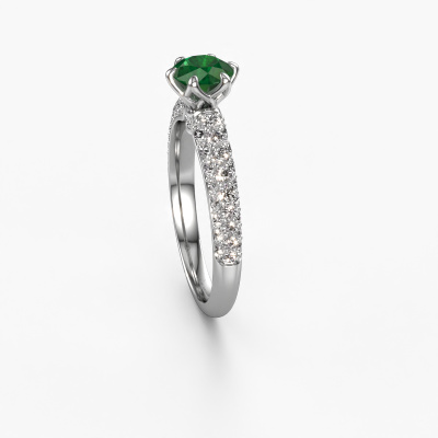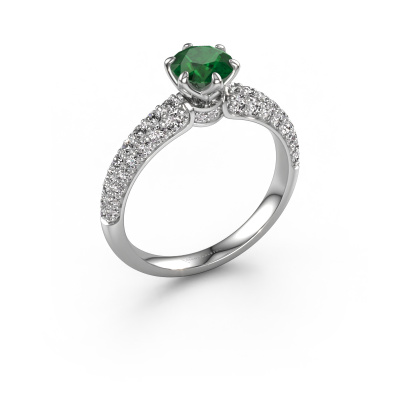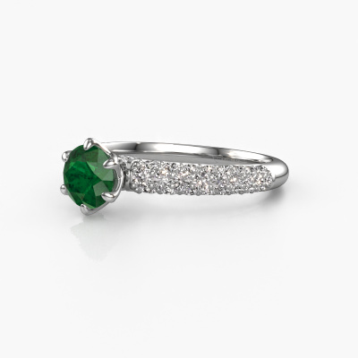 The ring shown above is called the Meryl. We call this type of ring a pavé solitaire ring because it has one centre gemstone and a band that is also pave set with gemstones. This engagement ring is made in 14 Carat white gold set with a 5.7 mm round emerald, and pave set diamonds at the sides. Each piece of jewellery is made just for you, with attention to detail and design.This exclusive white gold pavé solitaire engagement ring has an exquisite round emerald centre stone. To further accentuate the centre stone, the band is set full with more diamonds. Its open prong setting allows light to strike the emerald from various angles and this adds sparkle to your emerald ring. The photo shown above depicts the goldsmith's carefully handcrafted details of the ring. The high positioning of the centre stone is truly eye-catching. The perfect engagement ring for the crown jewel of your life!After receiving your order, our goldsmiths will passionately start the creative process of making your engagement ring in our own studio. Because we don't have a big stockpile, these costs will not be passed on to you. Our pricing is proof of that! We offer top quality jewels at lowest price, guaranteed.Have you found a specific engagement ring somewhere which you would like to give to your loved one? Please feel free to express your wishes to our jewel designers because we would be honoured to turn your design into a exclusive engagement ring. You can follow the development of your ring design because we use 3D drawings. This gives you a realistic preview of how your design will look. You can also preorder a dummy. A dummy is a plastic ring, which can be shaped according your ring design. You can try it on and check if its width and size are suitable for you. We will gladly send you a non-binding offer, based on a fair price/ quality ratio. It will amaze you, considering the quality of the ring and gemstones.To make it easier for you, we offer a 30 day return policy. Check our terms and conditions.