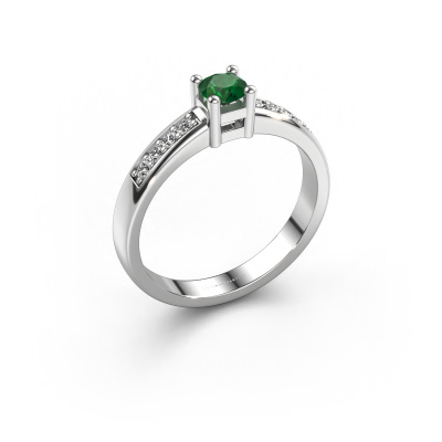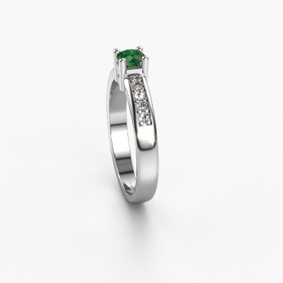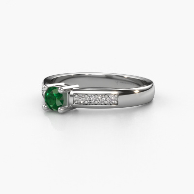 The ring shown above is called the Eline 2. We call this type of ring a pavé solitaire ring because it has one centre gemstone and a band that is also pave set with gemstones. The 14 Carat white gold engagement ring is set with a round 3.7 mm emerald centre stone and the band is pave set with diamond gemstones. Each jewel is unique in every way! Simply customize to your liking,This modern white gold pavé solitaire engagement ring has an exquisite round emerald centre stone. To further accentuate the centre stone, the band is fully set with more diamonds. Its open prong setting allows light to strike the emerald from various angles and this adds sparkle to your emerald ring. The photo shown above depicts the goldsmith's carefully handcrafted details of the ring. The high positioning of the centre stone is truly eye-catching. The perfect engagement ring for the crown jewel of your life! Because we design and deliver our own rings, we can offer you a engagement ring at a price you won't find anywhere else. A ring is made to order, which helps prevent excess supplies, so we can make you a great price offer. We understand it feels risky, buying your engagement ring online, but we will gladly assist in the designing process, taking your budget into consideration.Our team adds new designs to our online collection daily. Our designers and goldsmiths work together in creating the best design. We strive to offer a diverse collection of jewels. Perhaps you have a specific jewel design in mind. One you came across somewhere. Please contact us for a free consultation. We will make you an offer, based on a fair price/ quality ratio, that will baffle you.To make it easier for you, we offer a 30 day return policy. Check our terms and conditions.