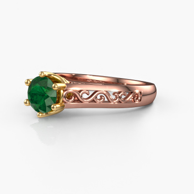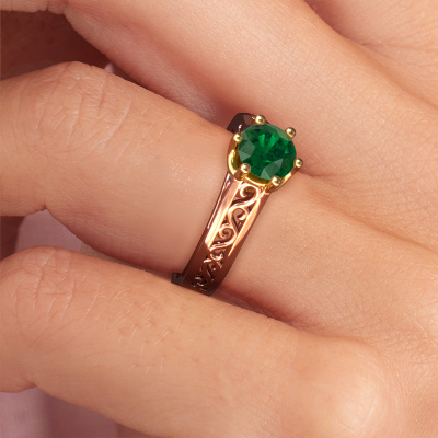 The ring shown above is called the Shan, we call this a solitaire ring because it contains a single gemstone. The engagement ring is made in 14 Carat rose gold and has a round emerald of 6 mm. The cool thing about our configurator is that you can compile your own piece of jewellery, into a completely personalized one. This solitaire ring is crafted in the precious metals rose gold with gold, but of course you are free to pick your own colours. Each piece of jewellery is made by a team of passionate goldsmiths and jewel designers. This will make your crown jewel truly eye-catching.The solitaire ring is a special type of engagement ring. Its open prong setting allows light to strike the gemstone from various angles. This Celtic engagement ring is a stunning eye-catcher because of the high positioning of the gemstone. In order for you to commemorate your proposal with a unique ring, we carefully adorn this solitaire ring by hand. The love of your life deserves nothing but the best. By using our modern techniques, we can design and customize the finest quality jewels with the utmost care for you. Our engagement rings are always priced 30 percent lower than other jewellers. We make engagement rings to order so we don't have to maintain a large stock. If you have a certain budget, we are more than happy to advice you accordingly.Have you found a specific engagement ring somewhere which you would like to give to your loved one? Please feel free to express your wishes to our jewel designers because we would be honoured to turn your design into a Celtic engagement ring. You can follow the development of your ring design because we use 3D drawings. This gives you a realistic preview of how your design will look. You can also preorder a dummy. A dummy is a plastic ring, which can be shaped according your ring design. You can try it on and check if its width and size are suitable for you. We will gladly send you a non-binding offer, based on a fair price/ quality ratio. It will amaze you, considering the quality of the ring and gemstones.To make it easier for you, we offer a 30 day return policy. Check our terms and conditions.