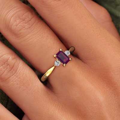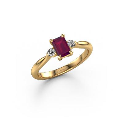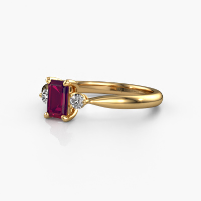 This 14 Carat gold ring is called Lieselot EME and is set with 6x4 mm rhodolite. Are you looking for a exclusive gold engagement ring which you can customize to your own liking? This exclusive engagement ring is set with rhodolite which is carefully selected for this specific ring in order to create the best effect. Our expert goldsmith will create your ring in our own crafting studio, where the rhodolite will be set with great care. The ring will then be polished till it shines perfectly. Nothing but the best for the love of your life! The great thing about our online tool is, that you can compile your own jewellery into a unique, personalized piece. Each piece of jewellery is made just for you, with attention to detail and design.After receiving your order, our goldsmiths will start the creative process of making your Lieselot EME engagement ring. We don't keep stock. This is advantageous because these costs will not be passed on to you. Therefore, we can offer jewellery at exceptionally low prices.Different styles of new rings are made daily by our team. Perhaps you have found a 3-stone engagement ring somewhere. One you would like to give to your loved one. Please feel free to share your thoughts and design with our jewel designers. We would love to turn your design into a exclusive engagement ring. You can follow the development of your ring design because we use very detailed 3D drawings. On top of that, you can order a dummy of the design. A dummy is a plastic ring, which can be shaped according your ring design. You can try it on and check if the engagement ring is up to standard. We will gladly send you a non-binding offer, based on a fair price/ quality ratio. The offer will baffle you, considering the quality of the ring and gemstones.To make it easier for you, we offer a 30 day return policy. Check our terms and conditions.