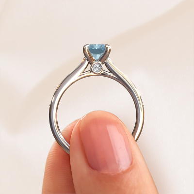 This platinum ring is called Valorie rad 2 and is set with 7x5 mm blue lab grown diamond. Are you looking for a fantasy platinum engagement ring which you can customize to your own liking? This fantasy engagement ring is set with blue lab grown diamond which is carefully selected for this specific ring in order to create the best effect. Our expert goldsmith will create your ring in our own crafting studio, where the blue lab grown diamond will be set with great care. The ring will then be polished till it shines perfectly. Nothing but the best for the love of your life! The great thing about our online tool is, that you can compile your own jewellery into a unique, personalized piece. Each piece of jewellery is made with passion and love by one of our master goldsmiths.Because we design and deliver our own rings, we can offer you a engagement ring at a price you won't find anywhere else. A ring is made to order, which helps prevent excess supplies, so we can make you a great price offer. We understand it feels risky, buying your engagement ring online, but we will gladly assist in the designing process, taking your budget into consideration.Do you have a specific ring in mind? One you came across somewhere. Please feel free to tell us your wishes and we will turn your design into a unique engagement ring. You can follow the development of your ring design because we use 3D drawings. This gives you a realistic preview of your design. We will gladly send you a non-binding offer, based on a fair price/ quality ratio. It will amaze you.To make it easier for you, we offer a 30 day return policy. Check our terms and conditions.