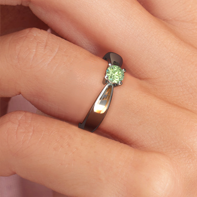 The ring shown above is called the Nichole. We call this a solitaire ring because it contains a single gemstone. The engagement ring is made in 14 Carat white gold and has a round green lab grown diamond of 4.2 mm. This extraordinary fantasy white gold solitaire engagement ring is set with a beautiful round green lab grown diamond to add sparkle to your proposal. The open prong setting allows light to strike the gemstone from various angles. Did you know a diamond represents everlasting love and fidelity? This makes it a perfect centrepiece. Our goldsmith carefully positions the gemstone of your choosing high on top of the ring, which makes it stand out. Each piece of jewellery is made just for you by our master goldsmiths in our own studio.