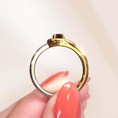 The ring shown above is called the Ceylin, we call this a solitaire ring because it contains a single gemstone. The engagement ring is made in 14 Carat gold and has a round garnet of 4 mm. The cool thing about our configurator is that you can compile your own piece of jewellery, into a completely personalized one. This solitaire ring is crafted in the precious metals gold with white gold, but of course you are free to pick your own colours. Each piece of jewellery is unique in every way! Simply customize to your liking,The solitaire ring is a special type of engagement ring. Its open prong setting allows light to strike the gemstone from various angles. This fantasy engagement ring is a stunning eye-catcher because of the high positioning of the gemstone. In order for you to commemorate your proposal with a unique ring, we carefully adorn this solitaire ring by hand. The love of your life deserves nothing but the best. Are you on a budget? Please feel free to contact us, so we can go discuss your options. We offer our engagement rings at guaranteed best price, because we make them to order. You won't find such a price anywhere else!Have you found a specific engagement ring somewhere which you would like to give to your loved one? Please feel free to express your wishes to our jewel designers because we would be honoured to turn your design into a fantasy engagement ring. You can follow the development of your ring design because we use 3D drawings. This gives you a realistic preview of how your design will look. You can also preorder a dummy. A dummy is a plastic ring, which can be shaped according your ring design. You can try it on and check if its width and size are suitable for you. We will gladly send you a non-binding offer, based on a fair price/ quality ratio. It will amaze you, considering the quality of the ring and gemstones.To make it easier for you, we offer a 30 day return policy. Check our terms and conditions.