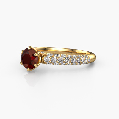 The ring shown above is called the Meryl. We call this type of ring a pavé solitaire ring because it has one centre gemstone and a band that is also pave set with gemstones. This engagement ring is made in 14 Carat gold set with a 5.7 mm round garnet, and pave set diamonds at the sides. Each piece of jewellery is made just for you, with attention to detail and design.This exclusive gold pavé solitaire engagement ring has an exquisite round garnet centre stone. To further accentuate the centre stone, the band is set full with more diamonds. Its open prong setting allows light to strike the garnet from various angles and this adds sparkle to your garnet ring. The photo shown above depicts the goldsmith's carefully handcrafted details of the ring. The high positioning of the centre stone is truly eye-catching. The perfect engagement ring for the crown jewel of your life!After receiving your order, our goldsmiths will passionately start the creative process of making your engagement ring in our own studio. Because we don't have a big stockpile, these costs will not be passed on to you. Our pricing is proof of that! We offer top quality jewels at lowest price, guaranteed.Have you found a specific engagement ring somewhere which you would like to give to your loved one? Please feel free to express your wishes to our jewel designers because we would be honoured to turn your design into a exclusive engagement ring. You can follow the development of your ring design because we use 3D drawings. This gives you a realistic preview of how your design will look. You can also preorder a dummy. A dummy is a plastic ring, which can be shaped according your ring design. You can try it on and check if its width and size are suitable for you. We will gladly send you a non-binding offer, based on a fair price/ quality ratio. It will amaze you, considering the quality of the ring and gemstones.To make it easier for you, we offer a 30 day return policy. Check our terms and conditions.