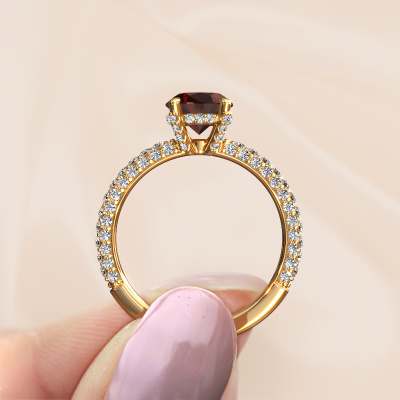 The ring shown above is called the Saskia 2 ovl. We call this type of ring a pavé solitaire ring because it has one centre gemstone and a band that is also pave set with gemstones. The 14 Carat gold engagement ring is set with a oval 9x7 mm garnet centre stone and the band is pave set with lab grown diamond gemstones. Each jewel is made just for you by our master goldsmiths in our own studio.This exclusive gold pavé solitaire engagement ring has an exquisite oval garnet centre stone. To further accentuate the centre stone, the band is fully set with more lab-grown diamonds. Its open prong setting allows light to strike the garnet from various angles and this adds sparkle to your garnet ring. The photo shown above depicts the goldsmith's carefully handcrafted details of the ring. The high positioning of the centre stone is truly eye-catching. The perfect engagement ring for the crown jewel of your life! After receiving your order, our goldsmiths will passionately start the creative process of making your engagement ring in our own studio. Because we don't have a big stockpile, these costs will not be passed on to you. Our pricing is proof of that! We offer top quality jewels at lowest price, guaranteed.Have you found a specific engagement ring somewhere which you would like to give to your loved one? Please feel free to express your wishes to our jewel designers because we would be honoured to turn your design into a exclusive engagement ring. You can follow the development of your ring design because we use 3D drawings. This gives you a realistic preview of how your design will look. You can also preorder a dummy. A dummy is a plastic ring, which can be shaped according your ring design. You can try it on and check if its width and size are suitable for you. We will gladly send you a non-binding offer, based on a fair price/ quality ratio. It will amaze you, considering the quality of the ring and gemstones.To make it easier for you, we offer a 30 day return policy. Check our terms and conditions.