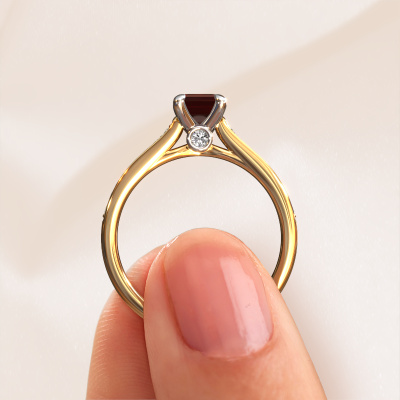 The ring shown above is called the Valorie eme 2. We call this type of ring a pavé solitaire ring because it has one centre gemstone and a band that is also pave set with gemstones. The 14 Carat gold engagement ring is set with a emerald cut 6.5x4.5 mm garnet centre stone and the band is pave set with diamond gemstones. Each jewel is made by a team of passionate goldsmiths and jewel designers. This will make your crown jewel truly eye-catching.This classic gold pavé solitaire engagement ring has an exquisite emerald cut garnet centre stone. To further accentuate the centre stone, the band is fully set with more diamonds. Its open prong setting allows light to strike the garnet from various angles and this adds sparkle to your garnet ring. The photo shown above depicts the goldsmith's carefully handcrafted details of the ring. The high positioning of the centre stone is truly eye-catching. The perfect engagement ring for the crown jewel of your life! By using our modern techniques, we can design and customize the finest quality jewels with the utmost care for you. Our engagement rings are always priced 30 percent lower than other jewellers. We make engagement rings to order so we don't have to maintain a large stock. If you have a certain budget, we are more than happy to advice you accordingly.Have you found a specific engagement ring somewhere which you would like to give to your loved one? Please feel free to express your wishes to our jewel designers because we would be honoured to turn your design into a classic engagement ring. You can follow the development of your ring design because we use 3D drawings. This gives you a realistic preview of how your design will look. You can also preorder a dummy. A dummy is a plastic ring, which can be shaped according your ring design. You can try it on and check if its width and size are suitable for you. We will gladly send you a non-binding offer, based on a fair price/ quality ratio. It will amaze you, considering the quality of the ring and gemstones.To make it easier for you, we offer a 30 day return policy. Check our terms and conditions.