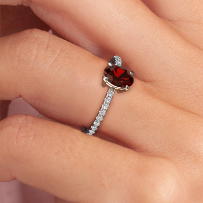 The ring shown above is called the Lynelle 2. We call this type of ring a pavé solitaire ring because it has one centre gemstone and a band that is also pave set with gemstones. This engagement ring is made in platinum set with a 7x5 mm oval garnet, and pave set diamonds at the sides. Each piece of jewellery is created to add sparkle to your finger, each jewel is lovingly made by hand by our goldsmiths.This classic platinum pavé solitaire engagement ring has an exquisite oval garnet centre stone. To further accentuate the centre stone, the band is set full with more diamonds. Its open prong setting allows light to strike the garnet from various angles and this adds sparkle to your garnet ring. The photo shown above depicts the goldsmith's carefully handcrafted details of the ring. The high positioning of the centre stone is truly eye-catching. The perfect engagement ring for the crown jewel of your life!After receiving your order, our goldsmiths will start the creative process of making your Lynelle 2 engagement ring. We don't keep stock. This is advantageous because these costs will not be passed on to you. Therefore, we can offer jewellery at exceptionally low prices.Do you have a specific ring in mind? One you came across somewhere. Please feel free to tell us your wishes and we will turn your design into a unique engagement ring. You can follow the development of your ring design because we use 3D drawings. This gives you a realistic preview of your design. We will gladly send you a non-binding offer, based on a fair price/ quality ratio. It will amaze you.To make it easier for you, we offer a 30 day return policy. Check our terms and conditions.