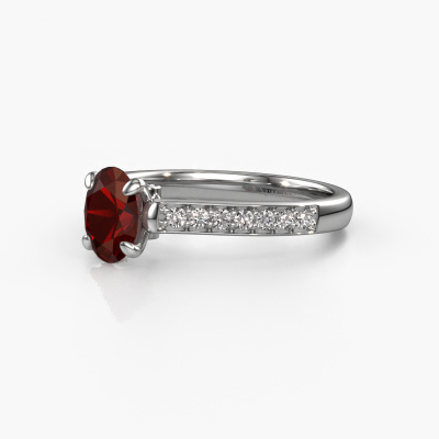 The ring shown above is called the Valorie ovl 2. We call this type of ring a pavé solitaire ring because it has one centre gemstone and a band that is also pave set with gemstones. This engagement ring is made in platinum set with a 7x5 mm oval garnet, and pave set lab-grown diamonds at the sides. Each piece of jewellery is made with passion and love by one of our master goldsmiths.This fashionable platinum pavé solitaire engagement ring has an exquisite oval garnet centre stone. To further accentuate the centre stone, the band is set full with more lab-grown diamonds. Its open prong setting allows light to strike the garnet from various angles and this adds sparkle to your garnet ring. The photo shown above depicts the goldsmith's carefully handcrafted details of the ring. The high positioning of the centre stone is truly eye-catching. The perfect engagement ring for the crown jewel of your life!Are you on a budget? Please feel free to contact us, so we can go discuss your options. We offer our engagement rings at guaranteed best price, because we make them to order. You won't find such a price anywhere else!Our team adds new designs to our online collection daily. Our designers and goldsmiths work together in creating the best design. We strive to offer a diverse collection of jewels. Perhaps you have a specific jewel design in mind. One you came across somewhere. Please contact us for a free consultation. We will make you an offer, based on a fair price/ quality ratio, that will baffle you.To make it easier for you, we offer a 30 day return policy. Check our terms and conditions.