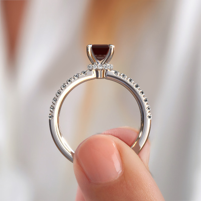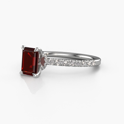 The ring shown above is called the Crystal EME 4. We call this type of ring a pavé solitaire ring because it has one centre gemstone and a band that is also pave set with gemstones. The platinum engagement ring is set with a emerald cut 7x5 mm garnet centre stone and the band is pave set with lab grown diamond gemstones. Each jewel is created to add sparkle to your finger, each jewel is lovingly made by hand by our goldsmiths.This fashionable platinum pavé solitaire engagement ring has an exquisite emerald cut garnet centre stone. To further accentuate the centre stone, the band is fully set with more lab-grown diamonds. Its open prong setting allows light to strike the garnet from various angles and this adds sparkle to your garnet ring. The photo shown above depicts the goldsmith's carefully handcrafted details of the ring. The high positioning of the centre stone is truly eye-catching. The perfect engagement ring for the crown jewel of your life! After receiving your order, our goldsmiths will passionately start the creative process of making your engagement ring in our own studio. Because we don't have a big stockpile, these costs will not be passed on to you. Our pricing is proof of that! We offer top quality jewels at lowest price, guaranteed.Our team adds new designs to our online collection daily. Our designers and goldsmiths work together in creating the best design. We strive to offer a diverse collection of jewels. Perhaps you have a specific jewel design in mind. One you came across somewhere. Please contact us for a free consultation. We will make you an offer, based on a fair price/ quality ratio, that will baffle you.To make it easier for you, we offer a 30 day return policy. Check our terms and conditions.