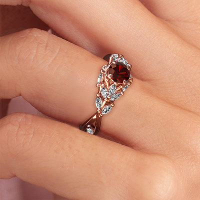 The ring shown above is called the Samantha RND. We call this type of ring a pavé solitaire ring because it has one centre gemstone and a band that is also pave set with gemstones. This engagement ring is made in 14 Carat rose gold set with a 5 mm round garnet, and pave set diamonds at the sides. Each piece of jewellery is made with passion and love by one of our master goldsmiths.This contemporary rose gold pavé solitaire engagement ring has an exquisite round garnet centre stone. To further accentuate the centre stone, the band is set full with more diamonds. Its open prong setting allows light to strike the garnet from various angles and this adds sparkle to your garnet ring. The photo shown above depicts the goldsmith's carefully handcrafted details of the ring. The high positioning of the centre stone is truly eye-catching. The perfect engagement ring for the crown jewel of your life!By using a combination of the latest modern techniques, combined with ancient crafting, we can make all our engagement rings in our own studio. Each jewel is made to order. This is advantageous because we can offer you a price you won't find anywhere else.Our designers and goldsmiths work together each day, creating new jewels. Perhaps you have found a nice contemporary engagement ring somewhere, which can be used to customize your unique ring. Please feel free to contact us. We will make you an offer, based on a fair price/ quality ratio, which will amaze you.To make it easier for you, we offer a 30 day return policy. Check our terms and conditions.