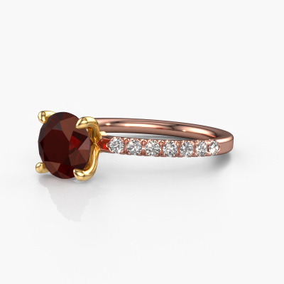 The ring shown above is called the Crystal RND 2. We call this type of ring a pavé solitaire ring because it has one centre gemstone and a band that is also pave set with gemstones. The 14 Carat rose gold engagement ring is set with a round 7.3 mm garnet centre stone and the band is pave set with lab grown diamond gemstones. Each jewel is unique in every way! Simply customize to your liking,This classic rose gold pavé solitaire engagement ring has an exquisite round garnet centre stone. To further accentuate the centre stone, the band is fully set with more lab-grown diamonds. Its open prong setting allows light to strike the garnet from various angles and this adds sparkle to your garnet ring. The photo shown above depicts the goldsmith's carefully handcrafted details of the ring. The high positioning of the centre stone is truly eye-catching. The perfect engagement ring for the crown jewel of your life! After receiving your order, our goldsmiths will start the creative process of making your Crystal RND 2 engagement ring. We don't keep stock. This is advantageous because these costs will not be passed on to you. Therefore, we can offer jewellery at exceptionally low prices.Different styles of new rings are made daily by our team. Perhaps you have found a pavé solitaire engagement ring somewhere. One you would like to give to your loved one. Please feel free to share your thoughts and design with our jewel designers. We would love to turn your design into a classic engagement ring. You can follow the development of your ring design because we use very detailed 3D drawings. On top of that, you can order a dummy of the design. A dummy is a plastic ring, which can be shaped according your ring design. You can try it on and check if the engagement ring is up to standard. We will gladly send you a non-binding offer, based on a fair price/ quality ratio. The offer will baffle you, considering the quality of the ring and gemstones.To make it easier for you, we offer a 30 day return policy. Check our terms and conditions.
