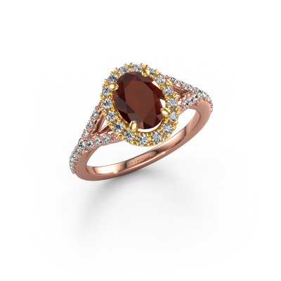 The ring shown above is called the Kimber OVL. We call this type of ring a pavé solitaire ring because it has one centre gemstone and a band that is also pave set with gemstones. The 14 Carat rose gold engagement ring is set with a oval 8x6 mm garnet centre stone and the band is pave set with lab grown diamond gemstones. Each jewel is made with passion and love by one of our master goldsmiths.This exclusive rose gold pavé solitaire engagement ring has an exquisite oval garnet centre stone. To further accentuate the centre stone, the band is fully set with more lab-grown diamonds. Its open prong setting allows light to strike the garnet from various angles and this adds sparkle to your garnet ring. The photo shown above depicts the goldsmith's carefully handcrafted details of the ring. The high positioning of the centre stone is truly eye-catching. The perfect engagement ring for the crown jewel of your life! By using a combination of the latest modern techniques, combined with ancient crafting, we can make all our engagement rings in our own studio. Each jewel is made to order. This is advantageous because we can offer you a price you won't find anywhere else.Our team adds new designs to our online collection daily. Our designers and goldsmiths work together in creating the best design. We strive to offer a diverse collection of jewels. Perhaps you have a specific jewel design in mind. One you came across somewhere. Please contact us for a free consultation. We will make you an offer, based on a fair price/ quality ratio, that will baffle you.To make it easier for you, we offer a 30 day return policy. Check our terms and conditions.