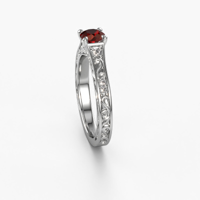The ring shown above is called the Mallory rnd. We call this type of ring a pavé solitaire ring because it has one centre gemstone and a band that is also pave set with gemstones. This engagement ring is made in 14 Carat white gold set with a 5 mm round garnet, and pave set lab-grown diamonds at the sides. Each piece of jewellery is made just for you by our master goldsmiths in our own studio.This vintage white gold pavé solitaire engagement ring has an exquisite round garnet centre stone. To further accentuate the centre stone, the band is set full with more lab-grown diamonds. Its open prong setting allows light to strike the garnet from various angles and this adds sparkle to your garnet ring. The photo shown above depicts the goldsmith's carefully handcrafted details of the ring. The high positioning of the centre stone is truly eye-catching. The perfect engagement ring for the crown jewel of your life!Because we design and deliver our own rings, we can offer you a engagement ring at a price you won't find anywhere else. A ring is made to order, which helps prevent excess supplies, so we can make you a great price offer. We understand it feels risky, buying your engagement ring online, but we will gladly assist in the designing process, taking your budget into consideration.Different styles of new rings are made daily by our team. Perhaps you have found a pavé solitaire engagement ring somewhere. One you would like to give to your loved one. Please feel free to share your thoughts and design with our jewel designers. We would love to turn your design into a vintage engagement ring. You can follow the development of your ring design because we use very detailed 3D drawings. On top of that, you can order a dummy of the design. A dummy is a plastic ring, which can be shaped according your ring design. You can try it on and check if the engagement ring is up to standard. We will gladly send you a non-binding offer, based on a fair price/ quality ratio. The offer will baffle you, considering the quality of the ring and gemstones.To make it easier for you, we offer a 30 day return policy. Check our terms and conditions.