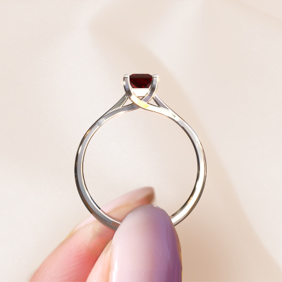 The ring shown above is called the Mia Square, we call this a solitaire ring because it contains a single gemstone. The engagement ring is made in platinum and has a princess garnet of 4 mm. The cool thing about our configurator is that you can compile your own piece of jewellery, into a completely personalized one. This solitaire ring is crafted in the precious metals platinum with platinum, but of course you are free to pick your own colours. Each piece of jewellery is made by a team of passionate goldsmiths and jewel designers. This will make your crown jewel truly eye-catching.The solitaire ring is a special type of engagement ring. Its open prong setting allows light to strike the gemstone from various angles. This modern engagement ring is a stunning eye-catcher because of the high positioning of the gemstone. In order for you to commemorate your proposal with a unique ring, we carefully adorn this solitaire ring by hand. The love of your life deserves nothing but the best. By using our modern techniques, we can design and customize the finest quality jewels with the utmost care for you. Our engagement rings are always priced 30 percent lower than other jewellers. We make engagement rings to order so we don't have to maintain a large stock. If you have a certain budget, we are more than happy to advice you accordingly.Have you found a specific engagement ring somewhere which you would like to give to your loved one? Please feel free to express your wishes to our jewel designers because we would be honoured to turn your design into a modern engagement ring. You can follow the development of your ring design because we use 3D drawings. This gives you a realistic preview of how your design will look. You can also preorder a dummy. A dummy is a plastic ring, which can be shaped according your ring design. You can try it on and check if its width and size are suitable for you. We will gladly send you a non-binding offer, based on a fair price/ quality ratio. It will amaze you, considering the quality of the ring and gemstones.To make it easier for you, we offer a 30 day return policy. Check our terms and conditions.