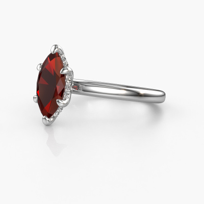 This platinum ring is called Simone MRQ 2 and is set with 11x5.5 mm garnet. What is it that makes your relationship unique? What is it about her that makes you want to bend down on one knee? The unique bond between the two of you is emphasized by an equally unique ring. A one of a kind round solitaire engagement ring made especially for her. That is why this fantasy ring fits her like a glove. Each specific detail of this round platinum garnet set engagement ring is hand-picked, crafted and polished by our expert goldsmith. The result is an exquisite ring, unique and perfectly crafted to perfection. That is what our expert Goldsmiths strive for. This jewel is made just for you by our master goldsmiths in our own studio.Because we design and deliver our own rings, we can offer you a engagement ring at a price you won't find anywhere else. A ring is made to order, which helps prevent excess supplies, so we can make you a great price offer. We understand it feels risky, buying your engagement ring online, but we will gladly assist in the designing process, taking your budget into consideration.Our designers and goldsmiths work together each day, creating new jewels. Perhaps you have found a nice fantasy engagement ring somewhere, which can be used to customize your unique ring. Please feel free to contact us. We will make you an offer, based on a fair price/ quality ratio, which will amaze you.To make it easier for you, we offer a 30 day return policy. Check our terms and conditions.