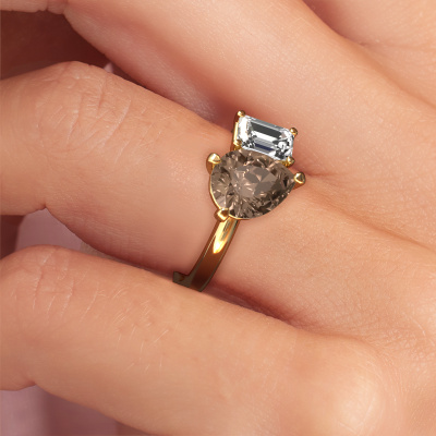 This 14 Carat gold ring is called Toi et Moi PER-EME and is set with brown diamond. Are you in the market for a unique gold engagement ring with a trendy appearance? Then this ring is perfect for you. Simply customize to your or her liking. This chic sparkling engagement ring is set with exquisite brown diamond. It has been carefully selected because your engagement ring must be adorned with nothing but the most beautiful gemstone. Our expert goldsmith will create your ring in our own studio where the brown diamond will be set with great care. The ring will then be polished to perfection to give it that extra sparkle. The perfect ring for your significant other! By using a combination of the latest modern techniques, combined with ancient crafting, we can make all our engagement rings in our own studio. Each jewel is made to order. This is advantageous because we can offer you a price you won't find anywhere else.Our team adds new designs to our online collection daily. Our designers and goldsmiths work together in creating the best design. We strive to offer a diverse collection of jewels. Perhaps you have a specific jewel design in mind. One you came across somewhere. Please contact us for a free consultation. We will make you an offer, based on a fair price/ quality ratio, that will baffle you.To make it easier for you, we offer a 30 day return policy. Check our terms and conditions.