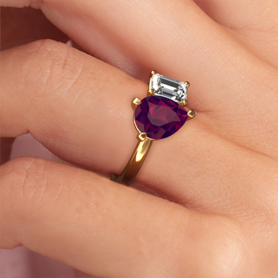 This 14 Carat gold ring is called Toi et Moi PER-EME and is set with rhodolite. Are you in the market for a unique gold engagement ring with a trendy appearance? Then this ring is perfect for you. Simply customize to your or her liking. This chic sparkling engagement ring is set with exquisite rhodolite. It has been carefully selected because your engagement ring must be adorned with nothing but the most beautiful gemstone. Our expert goldsmith will create your ring in our own studio where the rhodolite will be set with great care. The ring will then be polished to perfection to give it that extra sparkle. The perfect ring for your significant other! By using a combination of the latest modern techniques, combined with ancient crafting, we can make all our engagement rings in our own studio. Each jewel is made to order. This is advantageous because we can offer you a price you won't find anywhere else.Our team adds new designs to our online collection daily. Our designers and goldsmiths work together in creating the best design. We strive to offer a diverse collection of jewels. Perhaps you have a specific jewel design in mind. One you came across somewhere. Please contact us for a free consultation. We will make you an offer, based on a fair price/ quality ratio, that will baffle you.To make it easier for you, we offer a 30 day return policy. Check our terms and conditions.
