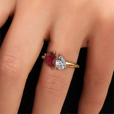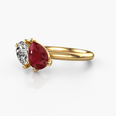 This 14 Carat gold ring is called Toi et Moi PER-PER and is set with ruby. Are you in the market for a unique gold engagement ring with a trendy appearance? Then this ring is perfect for you. Simply customize to your or her liking. This fashionable fashionable engagement ring is set with exquisite ruby. It has been carefully selected because your engagement ring must be adorned with nothing but the most beautiful gemstone. Our expert goldsmith will create your ring in our own studio where the ruby will be set with great care. The ring will then be polished to perfection to give it that extra sparkle. The perfect ring for your significant other! After receiving your order, our goldsmiths will passionately start the creative process of making your engagement ring in our own studio. Because we don't have a big stockpile, these costs will not be passed on to you. Our pricing is proof of that! We offer top quality jewels at lowest price, guaranteed.Our designers and goldsmiths work together each day, creating new jewels. Perhaps you have found a nice fashionable engagement ring somewhere, which can be used to customize your unique ring. Please feel free to contact us. We will make you an offer, based on a fair price/ quality ratio, which will amaze you.To make it easier for you, we offer a 30 day return policy. Check our terms and conditions.