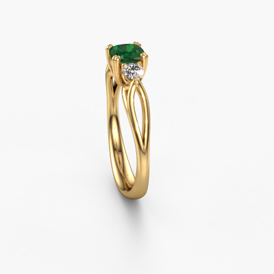 This 14 Carat gold ring is called Amie cus and is set with 5 mm emerald. Does your girlfriend fancy exclusive jewellery? Or would you like to show her that she deserves the finest jewellery? This gold ring is pure craftsmanship, love and passion combined with the latest techniques coming together in perfect harmony. It requires a keen eye, patience and a skilful hand to mould this ring into perfection. Just the job for our expert goldsmith! The emerald set gemstones gives this gold ring an extra glamorous appearance. Customize the style of the ajour engagement ring to her liking with a wide variety of precious metals and gemstones which you select. That is how you create a unique ring for the most exclusive woman in your life! This jewel is made just for you, with attention to detail and design.After receiving your order, our goldsmiths will passionately start the creative process of making your engagement ring in our own studio. Because we don't have a big stockpile, these costs will not be passed on to you. Our pricing is proof of that! We offer top quality jewels at lowest price, guaranteed.Have you found a specific engagement ring somewhere which you would like to give to your loved one? Please feel free to express your wishes to our jewel designers because we would be honoured to turn your design into a fantasy engagement ring. You can follow the development of your ring design because we use 3D drawings. This gives you a realistic preview of how your design will look. You can also preorder a dummy. A dummy is a plastic ring, which can be shaped according your ring design. You can try it on and check if its width and size are suitable for you. We will gladly send you a non-binding offer, based on a fair price/ quality ratio. It will amaze you, considering the quality of the ring and gemstones.To make it easier for you, we offer a 30 day return policy. Check our terms and conditions.