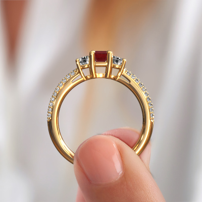 This 14 Carat gold ring is called Marielle EME and is set with 6x4 mm ruby. Does your girlfriend fancy exclusive jewellery? Or would you like to show her that she deserves the finest jewellery? This gold ring is pure craftsmanship, love and passion combined with the latest techniques coming together in perfect harmony. It requires a keen eye, patience and a skilful hand to mould this ring into perfection. Just the job for our expert goldsmith! The ruby set gemstones gives this gold ring an extra glamorous appearance. Customize the style of the special engagement ring to her liking with a wide variety of precious metals and gemstones which you select. That is how you create a unique ring for the most exclusive woman in your life! This jewel is created to add sparkle to your finger, each jewel is lovingly made by hand by our goldsmiths.Because we design and deliver our own rings, we can offer you a engagement ring at a price you won't find anywhere else. A ring is made to order, which helps prevent excess supplies, so we can make you a great price offer. We understand it feels risky, buying your engagement ring online, but we will gladly assist in the designing process, taking your budget into consideration.Our team adds new designs to our online collection daily. Our designers and goldsmiths work together in creating the best design. We strive to offer a diverse collection of jewels. Perhaps you have a specific jewel design in mind. One you came across somewhere. Please contact us for a free consultation. We will make you an offer, based on a fair price/ quality ratio, that will baffle you.To make it easier for you, we offer a 30 day return policy. Check our terms and conditions.