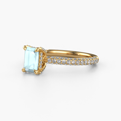 The ring shown above is called the Saskia eme 2. We call this type of ring a pavé solitaire ring because it has one centre gemstone and a band that is also pave set with gemstones. The 14 Carat gold engagement ring is set with a emerald cut 6.5x4.5 mm aquamarine centre stone and the band is pave set with diamond gemstones. Each jewel is made by a team of passionate goldsmiths and jewel designers. This will make your crown jewel truly eye-catching.This exclusive gold pavé solitaire engagement ring has an exquisite emerald cut aquamarine centre stone. To further accentuate the centre stone, the band is fully set with more diamonds. Its open prong setting allows light to strike the aquamarine from various angles and this adds sparkle to your aquamarine ring. The photo shown above depicts the goldsmith's carefully handcrafted details of the ring. The high positioning of the centre stone is truly eye-catching. The perfect engagement ring for the crown jewel of your life! By using our modern techniques, we can design and customize the finest quality jewels with the utmost care for you. Our engagement rings are always priced 30 percent lower than other jewellers. We make engagement rings to order so we don't have to maintain a large stock. If you have a certain budget, we are more than happy to advice you accordingly.Different styles of new rings are made daily by our team. Perhaps you have found a pavé solitaire engagement ring somewhere. One you would like to give to your loved one. Please feel free to share your thoughts and design with our jewel designers. We would love to turn your design into a exclusive engagement ring. You can follow the development of your ring design because we use very detailed 3D drawings. On top of that, you can order a dummy of the design. A dummy is a plastic ring, which can be shaped according your ring design. You can try it on and check if the engagement ring is up to standard. We will gladly send you a non-binding offer, based on a fair price/ quality ratio. The offer will baffle you, considering the quality of the ring and gemstones.To make it easier for you, we offer a 30 day return policy. Check our terms and conditions.