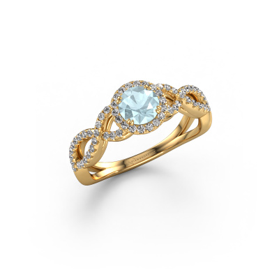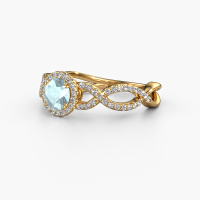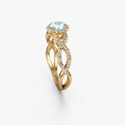 The ring shown above is called the Dionne rnd. We call this type of ring a pavé solitaire ring because it has one centre gemstone and a band that is also pave set with gemstones. The 14 Carat gold engagement ring is set with a round 5 mm aquamarine centre stone and the band is pave set with diamond gemstones. Each jewel is made just for you by our master goldsmiths in our own studio.This classic gold pavé solitaire engagement ring has an exquisite round aquamarine centre stone. To further accentuate the centre stone, the band is fully set with more diamonds. Its open prong setting allows light to strike the aquamarine from various angles and this adds sparkle to your aquamarine ring. The photo shown above depicts the goldsmith's carefully handcrafted details of the ring. The high positioning of the centre stone is truly eye-catching. The perfect engagement ring for the crown jewel of your life! Because we design and deliver our own rings, we can offer you a engagement ring at a price you won't find anywhere else. A ring is made to order, which helps prevent excess supplies, so we can make you a great price offer. We understand it feels risky, buying your engagement ring online, but we will gladly assist in the designing process, taking your budget into consideration.Do you have a specific ring in mind? One you came across somewhere. Please feel free to tell us your wishes and we will turn your design into a unique engagement ring. You can follow the development of your ring design because we use 3D drawings. This gives you a realistic preview of your design. We will gladly send you a non-binding offer, based on a fair price/ quality ratio. It will amaze you.To make it easier for you, we offer a 30 day return policy. Check our terms and conditions.