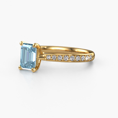 The ring shown above is called the Mignon eme 2. We call this type of ring a pavé solitaire ring because it has one centre gemstone and a band that is also pave set with gemstones. The 14 Carat gold engagement ring is set with a emerald cut 7x5 mm blue lab grown diamond centre stone and the band is pave set with lab grown diamond gemstones. Each jewel is made just for you, with attention to detail and design.This exclusive gold pavé solitaire engagement ring has an exquisite emerald cut blue lab grown diamond centre stone. To further accentuate the centre stone, the band is fully set with more lab-grown diamonds. Its open prong setting allows light to strike the blue lab grown diamond from various angles and this adds sparkle to your blue lab grown diamond ring. The photo shown above depicts the goldsmith's carefully handcrafted details of the ring. The high positioning of the centre stone is truly eye-catching. The perfect engagement ring for the crown jewel of your life! Are you on a budget? Please feel free to contact us, so we can go discuss your options. We offer our engagement rings at guaranteed best price, because we make them to order. You won't find such a price anywhere else!Do you have a specific ring in mind? One you came across somewhere. Please feel free to tell us your wishes and we will turn your design into a unique engagement ring. You can follow the development of your ring design because we use 3D drawings. This gives you a realistic preview of your design. We will gladly send you a non-binding offer, based on a fair price/ quality ratio. It will amaze you.To make it easier for you, we offer a 30 day return policy. Check our terms and conditions.