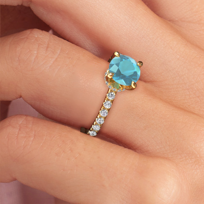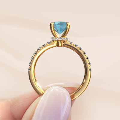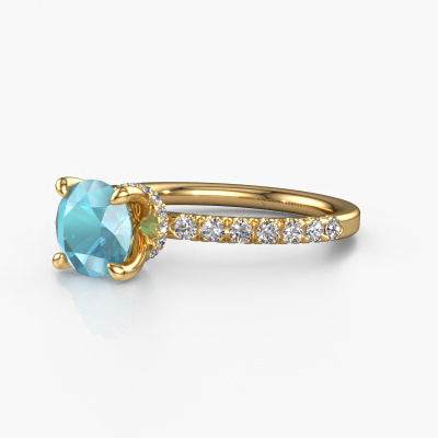 The ring shown above is called the Crystal rnd 4. We call this type of ring a pavé solitaire ring because it has one centre gemstone and a band that is also pave set with gemstones. The 14 Carat gold engagement ring is set with a round 7 mm blue topaz centre stone and the band is pave set with lab grown diamond gemstones. Each jewel is made to shine bright around your finger. Each jewel is hand made with love by our goldsmiths.This fantasy gold pavé solitaire engagement ring has an exquisite round blue topaz centre stone. To further accentuate the centre stone, the band is fully set with more lab-grown diamonds. Its open prong setting allows light to strike the blue topaz from various angles and this adds sparkle to your blue topaz ring. The photo shown above depicts the goldsmith's carefully handcrafted details of the ring. The high positioning of the centre stone is truly eye-catching. The perfect engagement ring for the crown jewel of your life! By using our modern techniques, we can design and customize the finest quality jewels with the utmost care for you. Our engagement rings are always priced 30 percent lower than other jewellers. We make engagement rings to order so we don't have to maintain a large stock. If you have a certain budget, we are more than happy to advice you accordingly.Have you found a specific engagement ring somewhere which you would like to give to your loved one? Please feel free to express your wishes to our jewel designers because we would be honoured to turn your design into a fantasy engagement ring. You can follow the development of your ring design because we use 3D drawings. This gives you a realistic preview of how your design will look. You can also preorder a dummy. A dummy is a plastic ring, which can be shaped according your ring design. You can try it on and check if its width and size are suitable for you. We will gladly send you a non-binding offer, based on a fair price/ quality ratio. It will amaze you, considering the quality of the ring and gemstones.To make it easier for you, we offer a 30 day return policy. Check our terms and conditions.