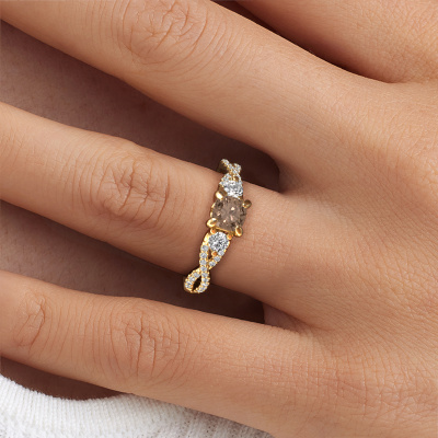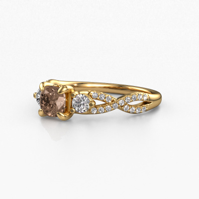 The ring shown above is called the Marilou CUS. We call this type of ring a 3-stone ring because it has one centre gemstone and a band that is also pave set with gemstones. The 14 Carat gold engagement ring is set with a cushion 0.70 crt brown diamond centre stone and the band is pave set with diamond gemstones. Each jewel is unique in every way! Simply customize to your liking,This traditional gold 3-stone engagement ring has an exquisite cushion brown diamond centre stone. To further accentuate the centre stone, the band is fully set with more diamonds. Its open prong setting allows light to strike the brown diamond from various angles and this adds sparkle to your brown diamond ring. The photo shown above depicts the goldsmith's carefully handcrafted details of the ring. The high positioning of the centre stone is truly eye-catching. The perfect engagement ring for the crown jewel of your life! By using a combination of the latest modern techniques, combined with ancient crafting, we can make all our engagement rings in our own studio. Each jewel is made to order. This is advantageous because we can offer you a price you won't find anywhere else.Our team adds new designs to our online collection daily. Our designers and goldsmiths work together in creating the best design. We strive to offer a diverse collection of jewels. Perhaps you have a specific jewel design in mind. One you came across somewhere. Please contact us for a free consultation. We will make you an offer, based on a fair price/ quality ratio, that will baffle you.To make it easier for you, we offer a 30 day return policy. Check our terms and conditions.