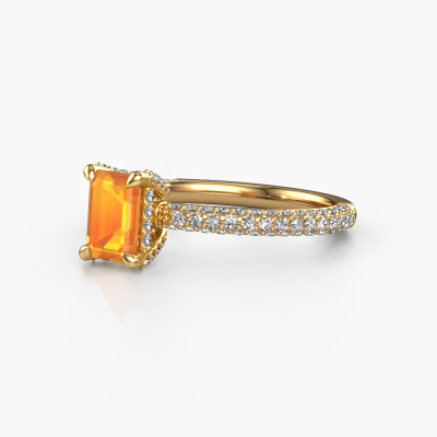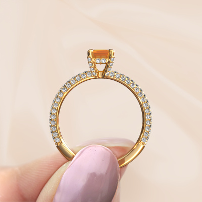 The ring shown above is called the Saskia eme 2. We call this type of ring a pavé solitaire ring because it has one centre gemstone and a band that is also pave set with gemstones. The 14 Carat gold engagement ring is set with a emerald cut 6.5x4.5 mm citrin centre stone and the band is pave set with diamond gemstones. Each jewel is made by a team of passionate goldsmiths and jewel designers. This will make your crown jewel truly eye-catching.This exclusive gold pavé solitaire engagement ring has an exquisite emerald cut citrin centre stone. To further accentuate the centre stone, the band is fully set with more diamonds. Its open prong setting allows light to strike the citrin from various angles and this adds sparkle to your citrin ring. The photo shown above depicts the goldsmith's carefully handcrafted details of the ring. The high positioning of the centre stone is truly eye-catching. The perfect engagement ring for the crown jewel of your life! By using our modern techniques, we can design and customize the finest quality jewels with the utmost care for you. Our engagement rings are always priced 30 percent lower than other jewellers. We make engagement rings to order so we don't have to maintain a large stock. If you have a certain budget, we are more than happy to advice you accordingly.Different styles of new rings are made daily by our team. Perhaps you have found a pavé solitaire engagement ring somewhere. One you would like to give to your loved one. Please feel free to share your thoughts and design with our jewel designers. We would love to turn your design into a exclusive engagement ring. You can follow the development of your ring design because we use very detailed 3D drawings. On top of that, you can order a dummy of the design. A dummy is a plastic ring, which can be shaped according your ring design. You can try it on and check if the engagement ring is up to standard. We will gladly send you a non-binding offer, based on a fair price/ quality ratio. The offer will baffle you, considering the quality of the ring and gemstones.To make it easier for you, we offer a 30 day return policy. Check our terms and conditions.