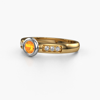 The ring shown above is called the Lieke. We call this type of ring a pavé solitaire ring because it has one centre gemstone and a band that is also pave set with gemstones. The 14 Carat gold engagement ring is set with a round 4 mm citrin centre stone and the band is pave set with diamond gemstones. Each jewel is unique in every way! Simply customize to your likingThis classic gold pavé solitaire engagement ring has an exquisite round citrin centre stone. To further accentuate the centre stone, the band is fully set with more diamonds. Its open prong setting allows light to strike the citrin from various angles and this adds sparkle to your citrin ring. The photo shown above depicts the goldsmith's carefully handcrafted details of the ring. The high positioning of the centre stone is truly eye-catching. The perfect engagement ring for the crown jewel of your life! By using a combination of the latest modern techniques, combined with ancient crafting, we can make all our engagement rings in our own studio. Each jewel is made to order. This is advantageous because we can offer you a price you won't find anywhere else.Different styles of new rings are made daily by our team. Perhaps you have found a pavé solitaire engagement ring somewhere. One you would like to give to your loved one. Please feel free to share your thoughts and design with our jewel designers. We would love to turn your design into a classic engagement ring. You can follow the development of your ring design because we use very detailed 3D drawings. On top of that, you can order a dummy of the design. A dummy is a plastic ring, which can be shaped according your ring design. You can try it on and check if the engagement ring is up to standard. We will gladly send you a non-binding offer, based on a fair price/ quality ratio. The offer will baffle you, considering the quality of the ring and gemstones.To make it easier for you, we offer a 30 day return policy. Check our terms and conditions.