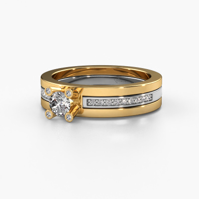 The ring shown above is called the Alisha. We call this type of ring a pavé solitaire ring because it has one centre gemstone and a band that is also pave set with gemstones. The 14 Carat gold engagement ring is set with a round 4 mm custom diamond centre stone and the band is pave set with diamond gemstones. Each jewel is unique in every way! Simply customize to your liking,This design gold pavé solitaire engagement ring has an exquisite round custom diamond centre stone. To further accentuate the centre stone, the band is fully set with more diamonds. Its open prong setting allows light to strike the custom diamond from various angles and this adds sparkle to your custom diamond ring. The photo shown above depicts the goldsmith's carefully handcrafted details of the ring. The high positioning of the centre stone is truly eye-catching. The perfect engagement ring for the crown jewel of your life! By using a combination of the latest modern techniques, combined with ancient crafting, we can make all our engagement rings in our own studio. Each jewel is made to order. This is advantageous because we can offer you a price you won't find anywhere else.Have you found a specific engagement ring somewhere which you would like to give to your loved one? Please feel free to express your wishes to our jewel designers because we would be honoured to turn your design into a design engagement ring. You can follow the development of your ring design because we use 3D drawings. This gives you a realistic preview of how your design will look. You can also preorder a dummy. A dummy is a plastic ring, which can be shaped according your ring design. You can try it on and check if its width and size are suitable for you. We will gladly send you a non-binding offer, based on a fair price/ quality ratio. It will amaze you, considering the quality of the ring and gemstones.To make it easier for you, we offer a 30 day return policy. Check our terms and conditions.