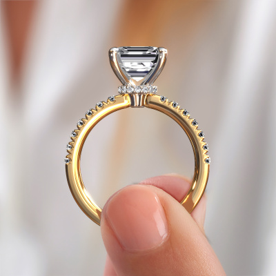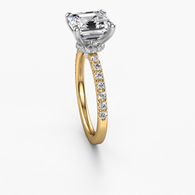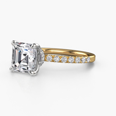 The ring shown above is called the Crystal ASSC 4. We call this type of ring a pavé solitaire ring because it has one centre gemstone and a band that is also pave set with gemstones. The 14 Carat gold engagement ring is set with a asscher 2.00 crt diamond centre stone and the band is pave set with diamond gemstones. Each jewel is made with passion and love by one of our master goldsmiths.This exclusive gold pavé solitaire engagement ring has an exquisite asscher diamond centre stone. To further accentuate the centre stone, the band is fully set with more diamonds. Its open prong setting allows light to strike the diamond from various angles and this adds sparkle to your diamond ring. The photo shown above depicts the goldsmith's carefully handcrafted details of the ring. The high positioning of the centre stone is truly eye-catching. The perfect engagement ring for the crown jewel of your life! By using a combination of the latest modern techniques, combined with ancient crafting, we can make all our engagement rings in our own studio. Each jewel is made to order. This is advantageous because we can offer you a price you won't find anywhere else.Our team adds new designs to our online collection daily. Our designers and goldsmiths work together in creating the best design. We strive to offer a diverse collection of jewels. Perhaps you have a specific jewel design in mind. One you came across somewhere. Please contact us for a free consultation. We will make you an offer, based on a fair price/ quality ratio, that will baffle you.To make it easier for you, we offer a 30 day return policy. Check our terms and conditions.