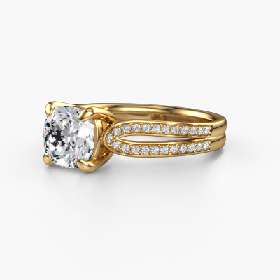 The ring shown above is called the Antonia cus 2. We call this type of ring a pavé solitaire ring because it has one centre gemstone and a band that is also pave set with gemstones. The 14 Carat gold engagement ring is set with a cushion 2.00 crt diamond centre stone and the band is pave set with lab grown diamond gemstones. Each jewel is made just for you by our master goldsmiths in our own studio.This fantasy gold pavé solitaire engagement ring has an exquisite cushion diamond centre stone. To further accentuate the centre stone, the band is fully set with more lab-grown diamonds. Its open prong setting allows light to strike the diamond from various angles and this adds sparkle to your diamond ring. The photo shown above depicts the goldsmith's carefully handcrafted details of the ring. The high positioning of the centre stone is truly eye-catching. The perfect engagement ring for the crown jewel of your life! By using our modern techniques, we can design and customize the finest quality jewels with the utmost care for you. Our engagement rings are always priced 30 percent lower than other jewellers. We make engagement rings to order so we don't have to maintain a large stock. If you have a certain budget, we are more than happy to advice you accordingly.Have you found a specific engagement ring somewhere which you would like to give to your loved one? Please feel free to express your wishes to our jewel designers because we would be honoured to turn your design into a fantasy engagement ring. You can follow the development of your ring design because we use 3D drawings. This gives you a realistic preview of how your design will look. You can also preorder a dummy. A dummy is a plastic ring, which can be shaped according your ring design. You can try it on and check if its width and size are suitable for you. We will gladly send you a non-binding offer, based on a fair price/ quality ratio. It will amaze you, considering the quality of the ring and gemstones.To make it easier for you, we offer a 30 day return policy. Check our terms and conditions.