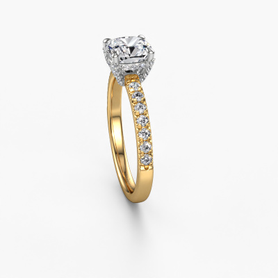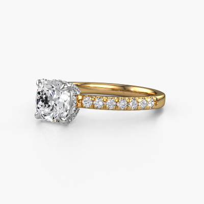 The ring shown above is called the Saskia 1 CUS. We call this type of ring a pavé solitaire ring because it has one centre gemstone and a band that is also pave set with gemstones. The 14 Carat gold engagement ring is set with a cushion 1.50 crt diamond centre stone and the band is pave set with diamond gemstones. Each jewel is made by a team of passionate goldsmiths and jewel designers. This will make your crown jewel truly eye-catching.This unique gold pavé solitaire engagement ring has an exquisite cushion diamond centre stone. To further accentuate the centre stone, the band is fully set with more diamonds. Its open prong setting allows light to strike the diamond from various angles and this adds sparkle to your diamond ring. The photo shown above depicts the goldsmith's carefully handcrafted details of the ring. The high positioning of the centre stone is truly eye-catching. The perfect engagement ring for the crown jewel of your life! By using a combination of the latest modern techniques, combined with ancient crafting, we can make all our engagement rings in our own studio. Each jewel is made to order. This is advantageous because we can offer you a price you won't find anywhere else.Our team adds new designs to our online collection daily. Our designers and goldsmiths work together in creating the best design. We strive to offer a diverse collection of jewels. Perhaps you have a specific jewel design in mind. One you came across somewhere. Please contact us for a free consultation. We will make you an offer, based on a fair price/ quality ratio, that will baffle you.To make it easier for you, we offer a 30 day return policy. Check our terms and conditions.
