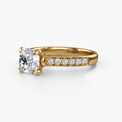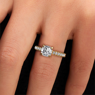 The ring shown above is called the Valorie cus 2. We call this type of ring a pavé solitaire ring because it has one centre gemstone and a band that is also pave set with gemstones. The 14 Carat gold engagement ring is set with a cushion 1.50 crt diamond centre stone and the band is pave set with diamond gemstones. Each jewel is made just for you by our master goldsmiths in our own studio.This traditional gold pavé solitaire engagement ring has an exquisite cushion diamond centre stone. To further accentuate the centre stone, the band is fully set with more diamonds. Its open prong setting allows light to strike the diamond from various angles and this adds sparkle to your diamond ring. The photo shown above depicts the goldsmith's carefully handcrafted details of the ring. The high positioning of the centre stone is truly eye-catching. The perfect engagement ring for the crown jewel of your life! By using a combination of the latest modern techniques, combined with ancient crafting, we can make all our engagement rings in our own studio. Each jewel is made to order. This is advantageous because we can offer you a price you won't find anywhere else.Our designers and goldsmiths work together each day, creating new jewels. Perhaps you have found a nice traditional engagement ring somewhere, which can be used to customize your unique ring. Please feel free to contact us. We will make you an offer, based on a fair price/ quality ratio, which will amaze you.To make it easier for you, we offer a 30 day return policy. Check our terms and conditions.