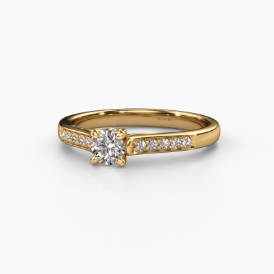 The ring shown above is called the Valorie RND 2. We call this type of ring a pavé solitaire ring because it has one centre gemstone and a band that is also pave set with gemstones. The 14 Carat gold engagement ring is set with a round 0.25 crt diamond centre stone and the band is pave set with lab grown diamond gemstones. Each jewel is made just for you, with attention to detail and design.This modern gold pavé solitaire engagement ring has an exquisite round diamond centre stone. To further accentuate the centre stone, the band is fully set with more lab-grown diamonds. Its open prong setting allows light to strike the diamond from various angles and this adds sparkle to your diamond ring. The photo shown above depicts the goldsmith's carefully handcrafted details of the ring. The high positioning of the centre stone is truly eye-catching. The perfect engagement ring for the crown jewel of your life! By using our modern techniques, we can design and customize the finest quality jewels with the utmost care for you. Our engagement rings are always priced 30 percent lower than other jewellers. We make engagement rings to order so we don't have to maintain a large stock. If you have a certain budget, we are more than happy to advice you accordingly.Our designers and goldsmiths work together each day, creating new jewels. Perhaps you have found a nice modern engagement ring somewhere, which can be used to customize your unique ring. Please feel free to contact us. We will make you an offer, based on a fair price/ quality ratio, which will amaze you.To make it easier for you, we offer a 30 day return policy. Check our terms and conditions.
