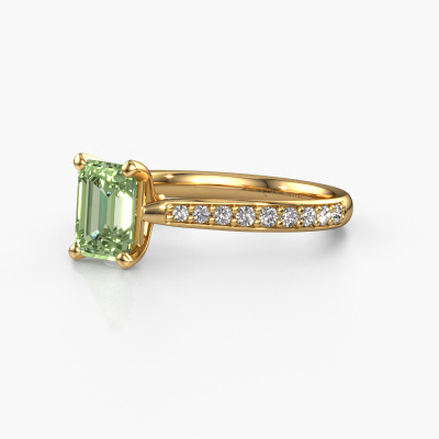 The ring shown above is called the Mignon eme 2. We call this type of ring a pavé solitaire ring because it has one centre gemstone and a band that is also pave set with gemstones. The 14 Carat gold engagement ring is set with a emerald cut 7x5 mm green lab grown diamond centre stone and the band is pave set with lab grown diamond gemstones. Each jewel is made just for you, with attention to detail and design.This exclusive gold pavé solitaire engagement ring has an exquisite emerald cut green lab grown diamond centre stone. To further accentuate the centre stone, the band is fully set with more lab-grown diamonds. Its open prong setting allows light to strike the green lab grown diamond from various angles and this adds sparkle to your green lab grown diamond ring. The photo shown above depicts the goldsmith's carefully handcrafted details of the ring. The high positioning of the centre stone is truly eye-catching. The perfect engagement ring for the crown jewel of your life! Are you on a budget? Please feel free to contact us, so we can go discuss your options. We offer our engagement rings at guaranteed best price, because we make them to order. You won't find such a price anywhere else!Do you have a specific ring in mind? One you came across somewhere. Please feel free to tell us your wishes and we will turn your design into a unique engagement ring. You can follow the development of your ring design because we use 3D drawings. This gives you a realistic preview of your design. We will gladly send you a non-binding offer, based on a fair price/ quality ratio. It will amaze you.To make it easier for you, we offer a 30 day return policy. Check our terms and conditions.