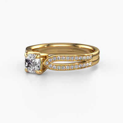 The ring shown above is called the Antonia cus 2. We call this type of ring a pavé solitaire ring because it has one centre gemstone and a band that is also pave set with gemstones. The 14 Carat gold engagement ring is set with a cushion 0.70 crt lab grown diamond centre stone and the band is pave set with lab grown diamond gemstones. Each jewel is made just for you by our master goldsmiths in our own studio.This fantasy gold pavé solitaire engagement ring has an exquisite cushion lab grown diamond centre stone. To further accentuate the centre stone, the band is fully set with more lab-grown diamonds. Its open prong setting allows light to strike the lab grown diamond from various angles and this adds sparkle to your lab grown diamond ring. The photo shown above depicts the goldsmith's carefully handcrafted details of the ring. The high positioning of the centre stone is truly eye-catching. The perfect engagement ring for the crown jewel of your life! By using our modern techniques, we can design and customize the finest quality jewels with the utmost care for you. Our engagement rings are always priced 30 percent lower than other jewellers. We make engagement rings to order so we don't have to maintain a large stock. If you have a certain budget, we are more than happy to advice you accordingly.Have you found a specific engagement ring somewhere which you would like to give to your loved one? Please feel free to express your wishes to our jewel designers because we would be honoured to turn your design into a fantasy engagement ring. You can follow the development of your ring design because we use 3D drawings. This gives you a realistic preview of how your design will look. You can also preorder a dummy. A dummy is a plastic ring, which can be shaped according your ring design. You can try it on and check if its width and size are suitable for you. We will gladly send you a non-binding offer, based on a fair price/ quality ratio. It will amaze you, considering the quality of the ring and gemstones.To make it easier for you, we offer a 30 day return policy. Check our terms and conditions.