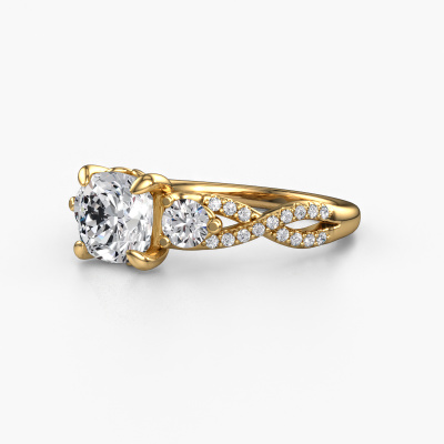 The ring shown above is called the Marilou CUS. We call this type of ring a 3-stone ring because it has one centre gemstone and a band that is also pave set with gemstones. The 14 Carat gold engagement ring is set with a cushion 1.50 crt lab grown diamond centre stone and the band is pave set with diamond gemstones. Each jewel is unique in every way! Simply customize to your liking,This traditional gold 3-stone engagement ring has an exquisite cushion lab grown diamond centre stone. To further accentuate the centre stone, the band is fully set with more diamonds. Its open prong setting allows light to strike the lab grown diamond from various angles and this adds sparkle to your lab grown diamond ring. The photo shown above depicts the goldsmith's carefully handcrafted details of the ring. The high positioning of the centre stone is truly eye-catching. The perfect engagement ring for the crown jewel of your life! By using a combination of the latest modern techniques, combined with ancient crafting, we can make all our engagement rings in our own studio. Each jewel is made to order. This is advantageous because we can offer you a price you won't find anywhere else.Our team adds new designs to our online collection daily. Our designers and goldsmiths work together in creating the best design. We strive to offer a diverse collection of jewels. Perhaps you have a specific jewel design in mind. One you came across somewhere. Please contact us for a free consultation. We will make you an offer, based on a fair price/ quality ratio, that will baffle you.To make it easier for you, we offer a 30 day return policy. Check our terms and conditions.