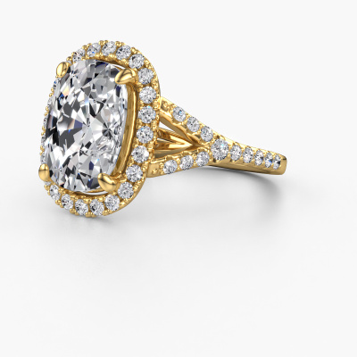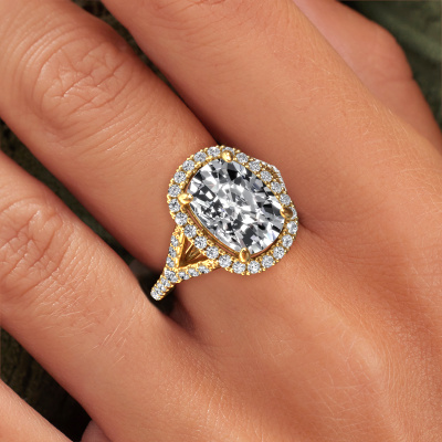 The ring shown above is called the Kimber CSH. We call this type of ring a pavé solitaire ring because it has one centre gemstone and a band that is also pave set with gemstones. The 14 Carat gold engagement ring is set with a cushion rectangle 4.50 crt lab grown diamond centre stone and the band is pave set with lab grown diamond gemstones. Each jewel is made just for you by our master goldsmiths in our own studio.This classic gold pavé solitaire engagement ring has an exquisite cushion rectangle lab grown diamond centre stone. To further accentuate the centre stone, the band is fully set with more lab-grown diamonds. Its open prong setting allows light to strike the lab grown diamond from various angles and this adds sparkle to your lab grown diamond ring. The photo shown above depicts the goldsmith's carefully handcrafted details of the ring. The high positioning of the centre stone is truly eye-catching. The perfect engagement ring for the crown jewel of your life! Because we design and deliver our own rings, we can offer you a engagement ring at a price you won't find anywhere else. A ring is made to order, which helps prevent excess supplies, so we can make you a great price offer. We understand it feels risky, buying your engagement ring online, but we will gladly assist in the designing process, taking your budget into consideration.Our designers and goldsmiths work together each day, creating new jewels. Perhaps you have found a nice classic engagement ring somewhere, which can be used to customize your unique ring. Please feel free to contact us. We will make you an offer, based on a fair price/ quality ratio, which will amaze you.To make it easier for you, we offer a 30 day return policy. Check our terms and conditions.