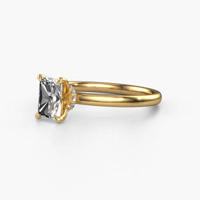 The ring shown above is called the Crystal RAD 3. We call this type of ring a solitaire ring because it has one centre gemstone and a band that is also pave set with gemstones. The 14 Carat gold engagement ring is set with a radiant 0.75 crt lab grown diamond centre stone and the band is pave set with diamond gemstones. Each jewel is made just for you by our master goldsmiths in our own studio.This classic gold solitaire engagement ring has an exquisite radiant lab grown diamond centre stone. To further accentuate the centre stone, the band is fully set with more diamonds. Its open prong setting allows light to strike the lab grown diamond from various angles and this adds sparkle to your lab grown diamond ring. The photo shown above depicts the goldsmith's carefully handcrafted details of the ring. The high positioning of the centre stone is truly eye-catching. The perfect engagement ring for the crown jewel of your life! Are you on a budget? Please feel free to contact us, so we can go discuss your options. We offer our engagement rings at guaranteed best price, because we make them to order. You won't find such a price anywhere else!Have you found a specific engagement ring somewhere which you would like to give to your loved one? Please feel free to express your wishes to our jewel designers because we would be honoured to turn your design into a classic engagement ring. You can follow the development of your ring design because we use 3D drawings. This gives you a realistic preview of how your design will look. You can also preorder a dummy. A dummy is a plastic ring, which can be shaped according your ring design. You can try it on and check if its width and size are suitable for you. We will gladly send you a non-binding offer, based on a fair price/ quality ratio. It will amaze you, considering the quality of the ring and gemstones.To make it easier for you, we offer a 30 day return policy. Check our terms and conditions.