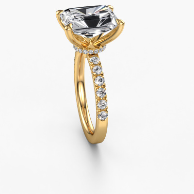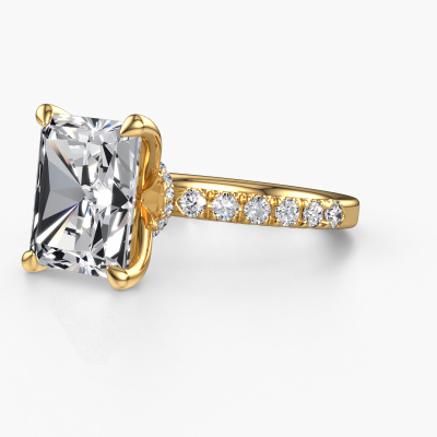 The ring shown above is called the Crystal RAD 4. We call this type of ring a pavé solitaire ring because it has one centre gemstone and a band that is also pave set with gemstones. The 14 Carat gold engagement ring is set with a radiant 5.05 crt lab grown diamond centre stone and the band is pave set with lab grown diamond gemstones. Each jewel is made with passion and love by one of our master goldsmiths.This fashionable gold pavé solitaire engagement ring has an exquisite radiant lab grown diamond centre stone. To further accentuate the centre stone, the band is fully set with more lab-grown diamonds. Its open prong setting allows light to strike the lab grown diamond from various angles and this adds sparkle to your lab grown diamond ring. The photo shown above depicts the goldsmith's carefully handcrafted details of the ring. The high positioning of the centre stone is truly eye-catching. The perfect engagement ring for the crown jewel of your life! After receiving your order, our goldsmiths will passionately start the creative process of making your engagement ring in our own studio. Because we don't have a big stockpile, these costs will not be passed on to you. Our pricing is proof of that! We offer top quality jewels at lowest price, guaranteed.Do you have a specific ring in mind? One you came across somewhere. Please feel free to tell us your wishes and we will turn your design into a unique engagement ring. You can follow the development of your ring design because we use 3D drawings. This gives you a realistic preview of your design. We will gladly send you a non-binding offer, based on a fair price/ quality ratio. It will amaze you.To make it easier for you, we offer a 30 day return policy. Check our terms and conditions.